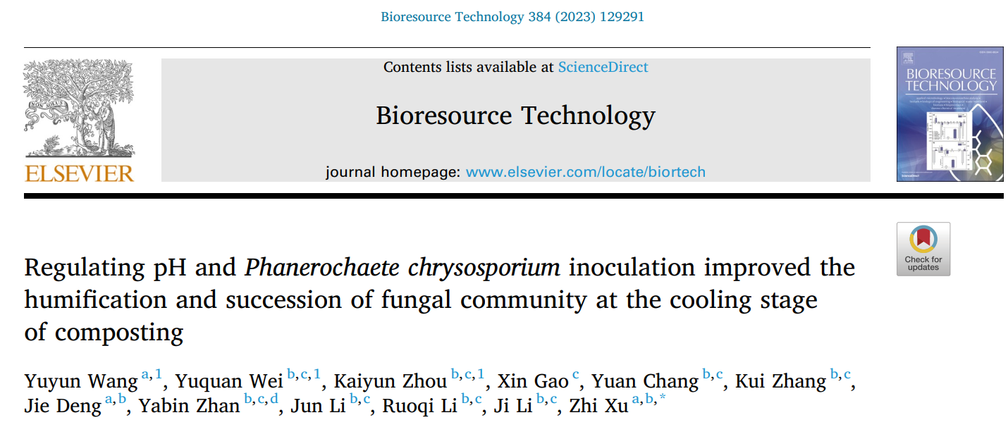 本站消息 近日,资源与环境学院徐智教授团队最新的研究论文“Regulating pH andPhanerochaete chrysosporiuminoculation improved the humification and succession of fungal community at the cooling stage of composting”在《Bioresource Technology》(一区TOP期刊,IF=11.889)期刊上在线发表。据悉,这是徐智教授团队在该期刊上发表的围绕农业废弃物肥料化基质化利用的微生物强化堆肥腐殖化过程相关研究的第4篇研究论文。