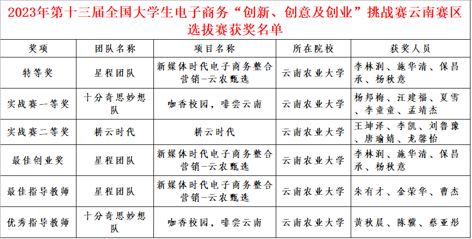 本站消息 6月23日至24日,第十三届全国大学生电子商务“创新、创意及创业”挑战赛云南赛区省级选拔赛在滇西应用技术大学落下帷幕。我校共有5支队伍晋级全省选拔赛,最终荣获常规赛特等奖1项、实战赛(产教融合)一等奖1项、实战赛(乡村振兴)二等奖1项,并荣获最佳创业奖、最佳指导老师奖,优秀指导老师奖。