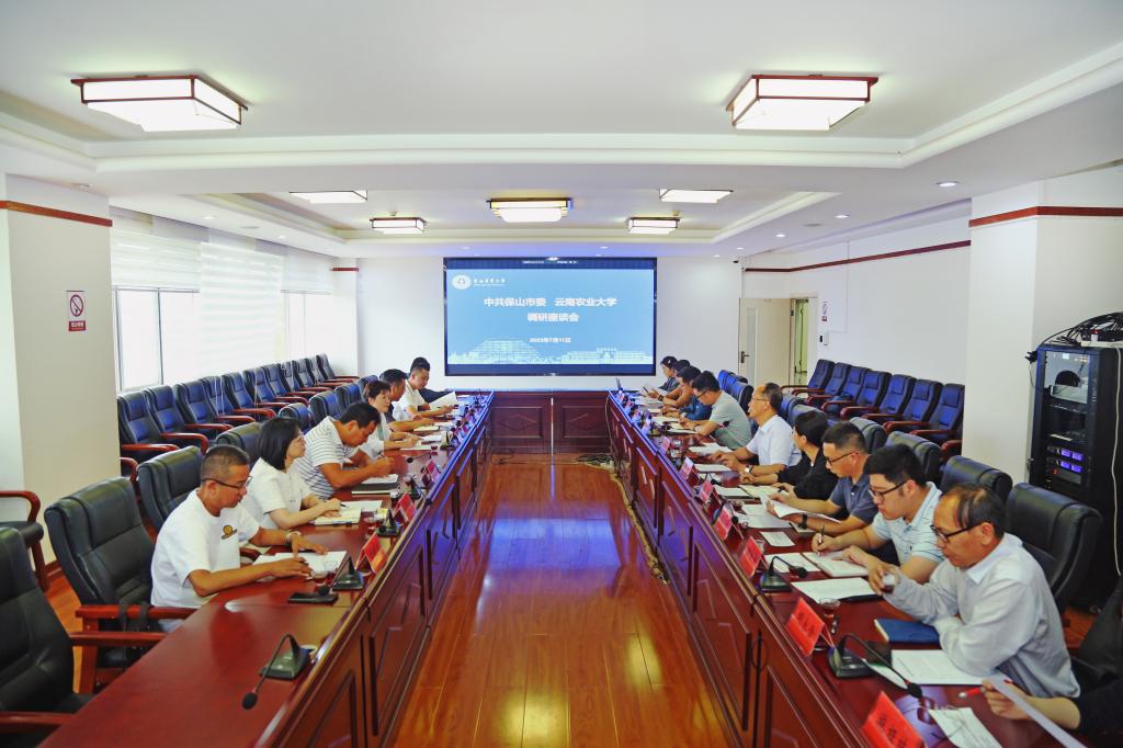 本站消息 7月11日,保山市委一行7人来校调研,就保山咖啡产业发展,校地合作,产学研融合展开交流。副校长李宏在至诚楼424会议室与来访一行座谈,学校相关学院、部门负责人,专家、教授参加座谈。
