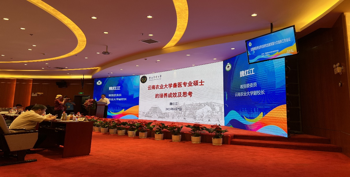 教指委委员、学校副校长魏红江作题为《云南农业大学兽医专业硕士的培养成效及思考》的大会报告。5所高校分别就创新专业学位研究生培养模式、培养兽医行业精英人才,新时代兽医领军人才培养思考与实践,兽医专业学位人才培养中的问题与对策,兽医专业学位研究生“项目制”培养模式探索与实践,根植草原、兽医专业学位培养模式创新与思考进行了大会交流。2位优秀毕业生代表进行了汇报工作。