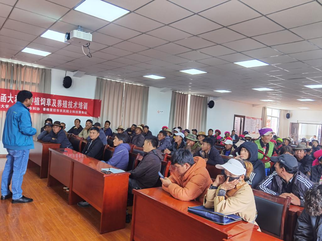 香格里拉市农民院士科技服务以国家重点研发子项目《香格里拉迪庆藏猪产业提质增效关键技术集成与示范》为依托,以动物医学院严玉霖教授为负责人在迪庆州香格里拉市小中甸镇成立农民院士科技服务站。科技服务站以当地藏猪、牦牛、绵羊、尼西鸡、那米鸡等地方特色畜禽品种为服务对象,指导培训当地兽医和养殖户,防控重大动物疾病,提升养殖水平,壮大发展当地畜牧产业。