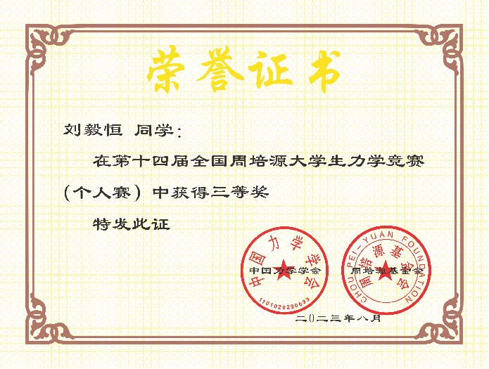 本站消息 近日,由中国力学学会和周培源基金会共同主办的第十四届全国周培源大学生力学竞赛获奖名单公布,我校刘毅恒等2位同学荣获三等奖(云南省最好成绩),吴珂凡、田洪等19名同学荣获优秀奖,取得近年来的最好成绩,凸显学校基础力学教育水平再上台阶!