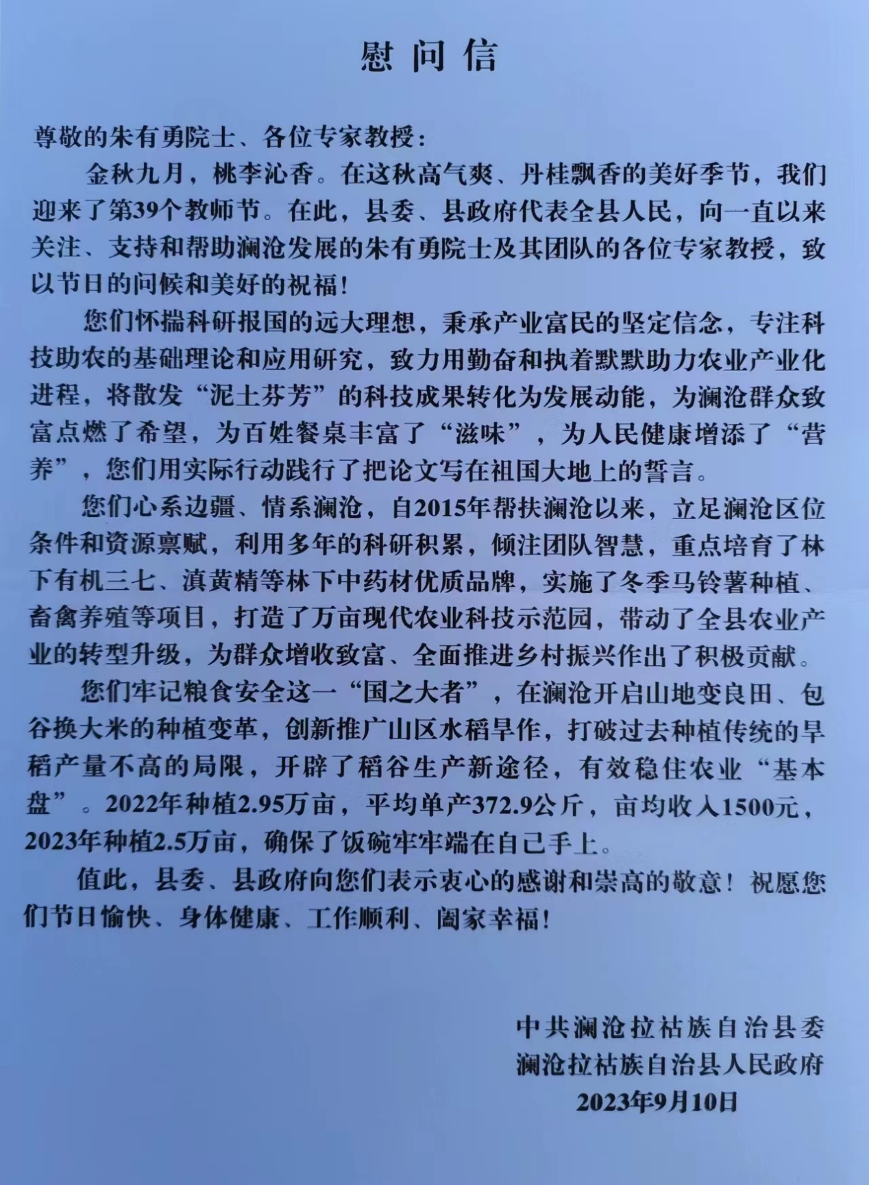 慰问信中写到,朱有勇院士及其团队的各位专家教授心系边疆、情系澜沧,自2015年帮扶澜沧以来,立足澜沧区位条件和资源禀赋,利用多年的科研积累,倾注团队智慧,重点培育了林下有机三七、滇黄精等林下中药材优质品牌,实施了冬季马铃薯种植、畜禽养殖等项目,开启了山地变良田、包谷换大米的稻谷生产新途径,打造了万亩现代农业科技示范园,带动了全县农业产业的转型升级,为群众增收致富、全面推进乡村振兴作出了积极贡献。县委、县政府向朱有勇院士及其团队的各位专家教授表示衷心的感谢和崇高的敬意!祝愿他们节日愉快、身体健康、工作顺利、阖家幸福!