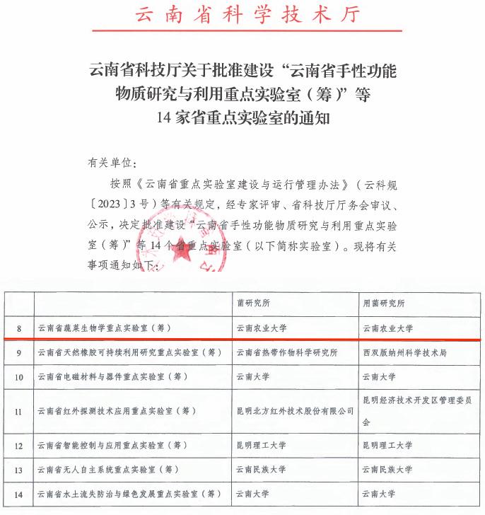 本站消息 近日,云南省科技厅发布了关于批准建设“云南省手性功能物质研究与利用重点实验室(筹)”等14家省重点实验室的通知,由学校园林园艺学院牵头申报的“云南省蔬菜生物学重点实验室”获批认定进入2年培育期,标志着学校在高原特色现代农业领域平台建设上再上新台阶。
