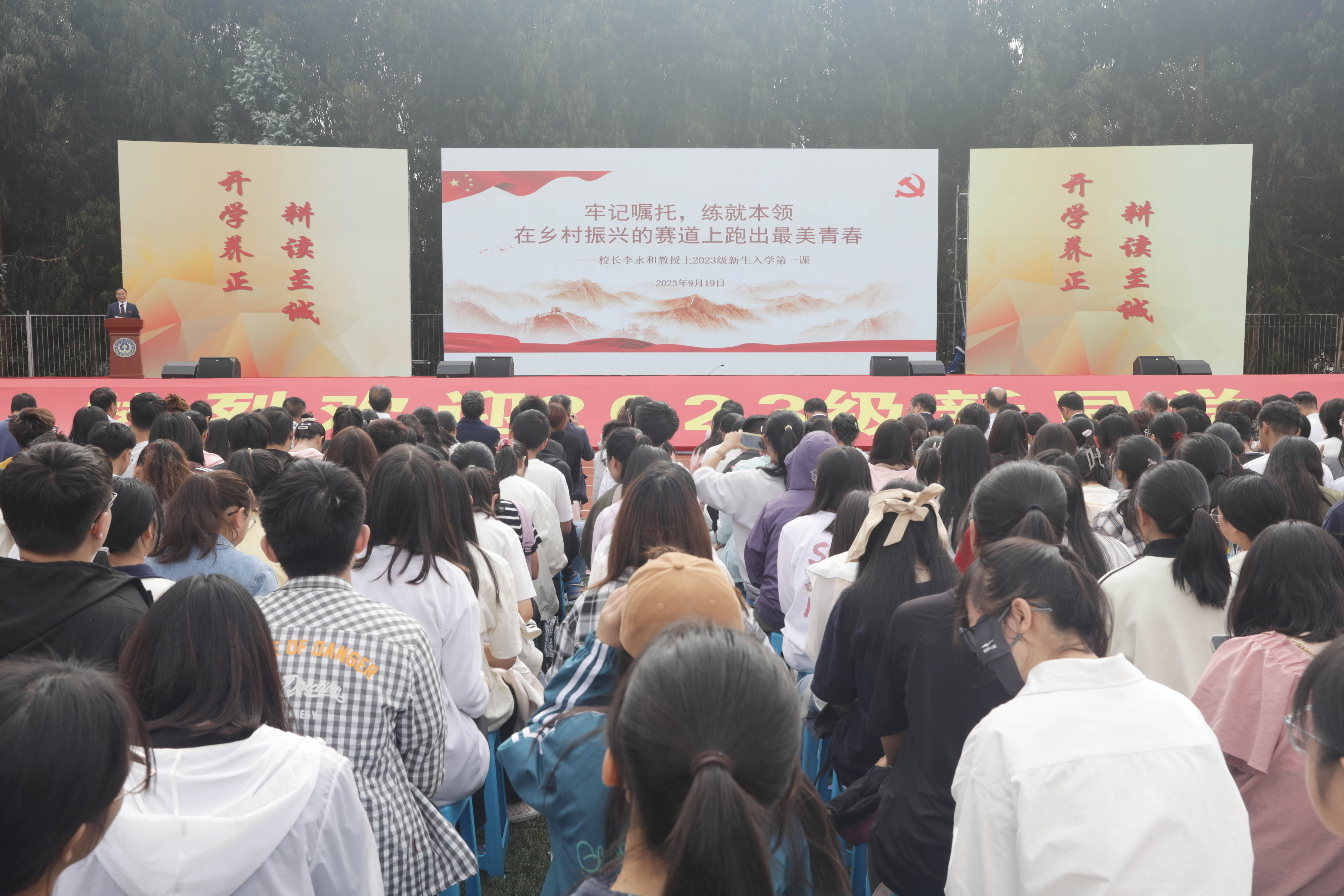 本站消息 9月19日,校长李永和以《牢记嘱托 练就本领 在乡村振兴的赛道上跑出最美青春》为题,为2023级7988名新生讲授“开学第一课”,从在回望校史中追寻信仰之光、在感受辉煌中明确前进方向、在奋进未来中学会“自找苦吃”三个方面,勉励同学们不负时代,不负韶华,在“自找苦吃”中收获大有可为的“甘甜”,努力成为堪当民族复兴重任的时代新人。学校党委书记黎素梅主持“开学第一课”。