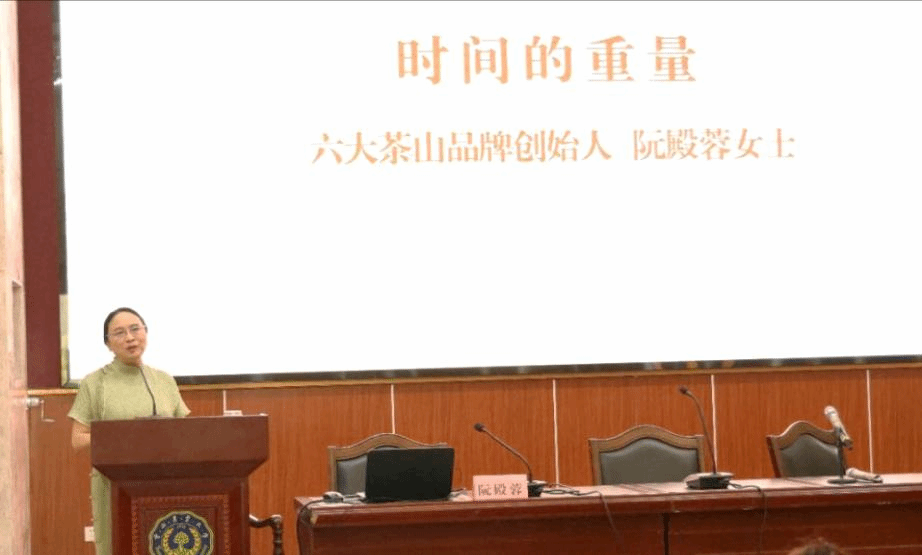 阮殿蓉女士首先对“六大茶山”品牌多年来的发展历程进行了简要回顾,并结合自己多年在茶行业中的经验,围绕云茶产业的发展方向,对如何学习茶专业、经营茶企业、发展茶行业进行了系统生动的论述。她表示,“六大茶山”之所以能不断提升品牌价值,是因为始终保持着对茶叶热爱的初心,并用心对待每一片茶叶,始终秉持爱心和责任心,努力打造出具有匠心的企业文化,并时刻怀着感恩之心对待消费者。阮殿蓉女士还表示,希望到场的师生都能始终对茶叶保持热爱,努力学好茶专业,为云茶产业的发展作出努力,六大茶山期待更多优秀的茶学毕业生加入。