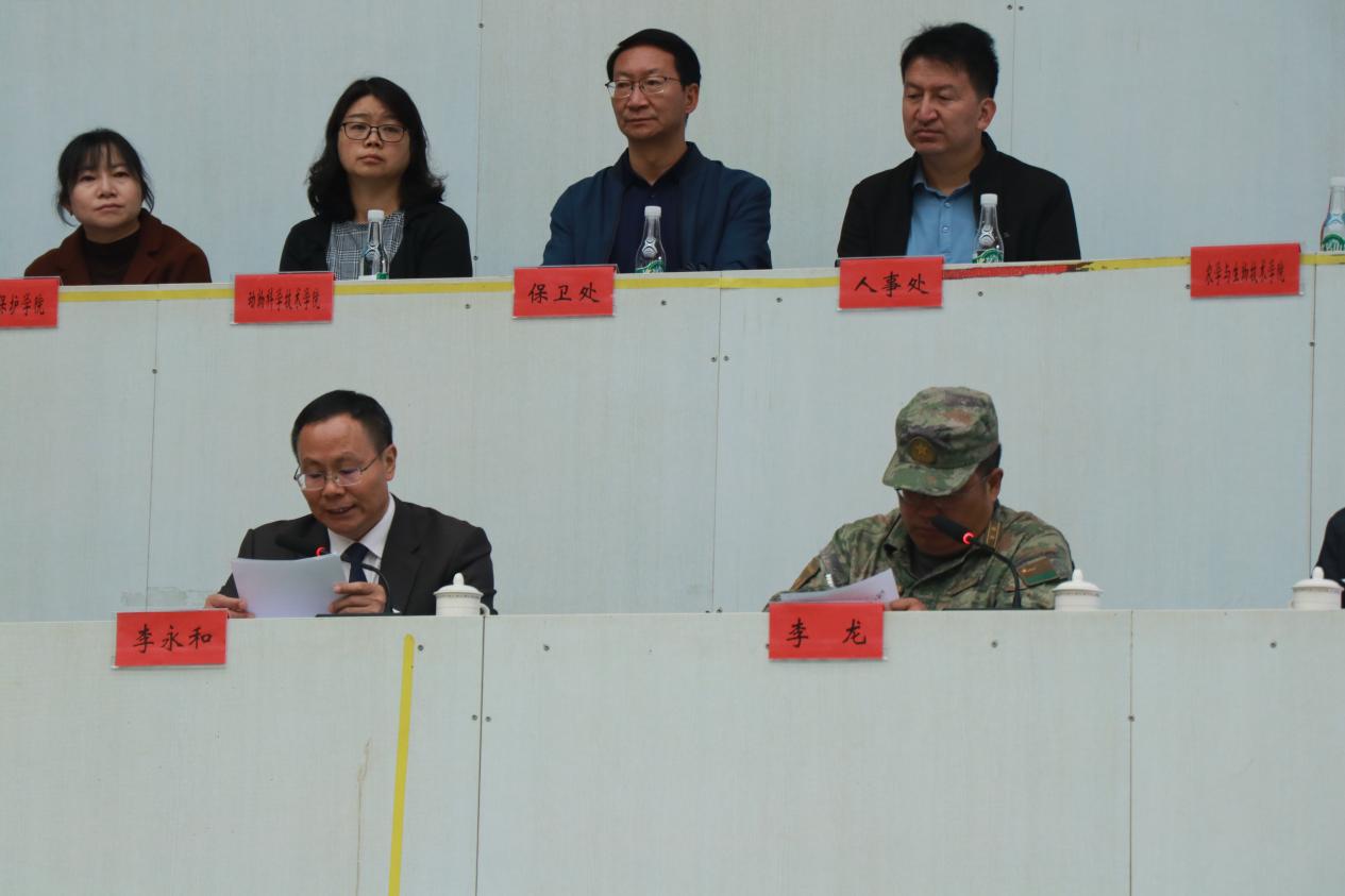 李永和作动员讲话。他指出,军训是一项根据《中华人民共和国国防法》和《中华人民共和国教育法》等相关规定作出的制度性安排,是学生接受国防教育的基本形式和必修课,是培养“四有”人才的重要措施,也是壮大国防力量的有效手段。为确保军训工作的顺利开展,他提出了三点工作要求:一是提高认识,敢于吃苦。同学们要从思想高度上正确认识参加军训的重要性,把军训看作是一次磨炼个人意志、培养军人品质的好时机;二是恪守纪律,科学施训。全体参训学生要严格遵守学校的各种规章制度和军训要求,全体教官要坚持以生为本、关爱学生、练出水平、训出质量;三是履行职责,做好服务。学校相关部门和学院分管学生工作负责人、辅导员要切实履行好岗位职责,加强军训期间的学生管理工作,做好后勤保障服务和人文关怀。