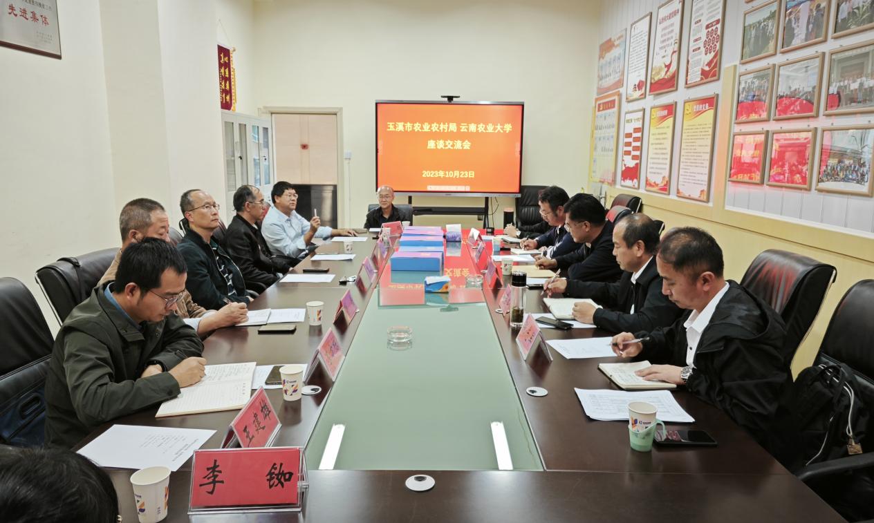 本站消息 10月23日,玉溪市农业农村局局长郭铭强一行来访学校,就推进校地合作进行交流。副校长李宏、国内合作与社会服务处和相关专家参加座谈。