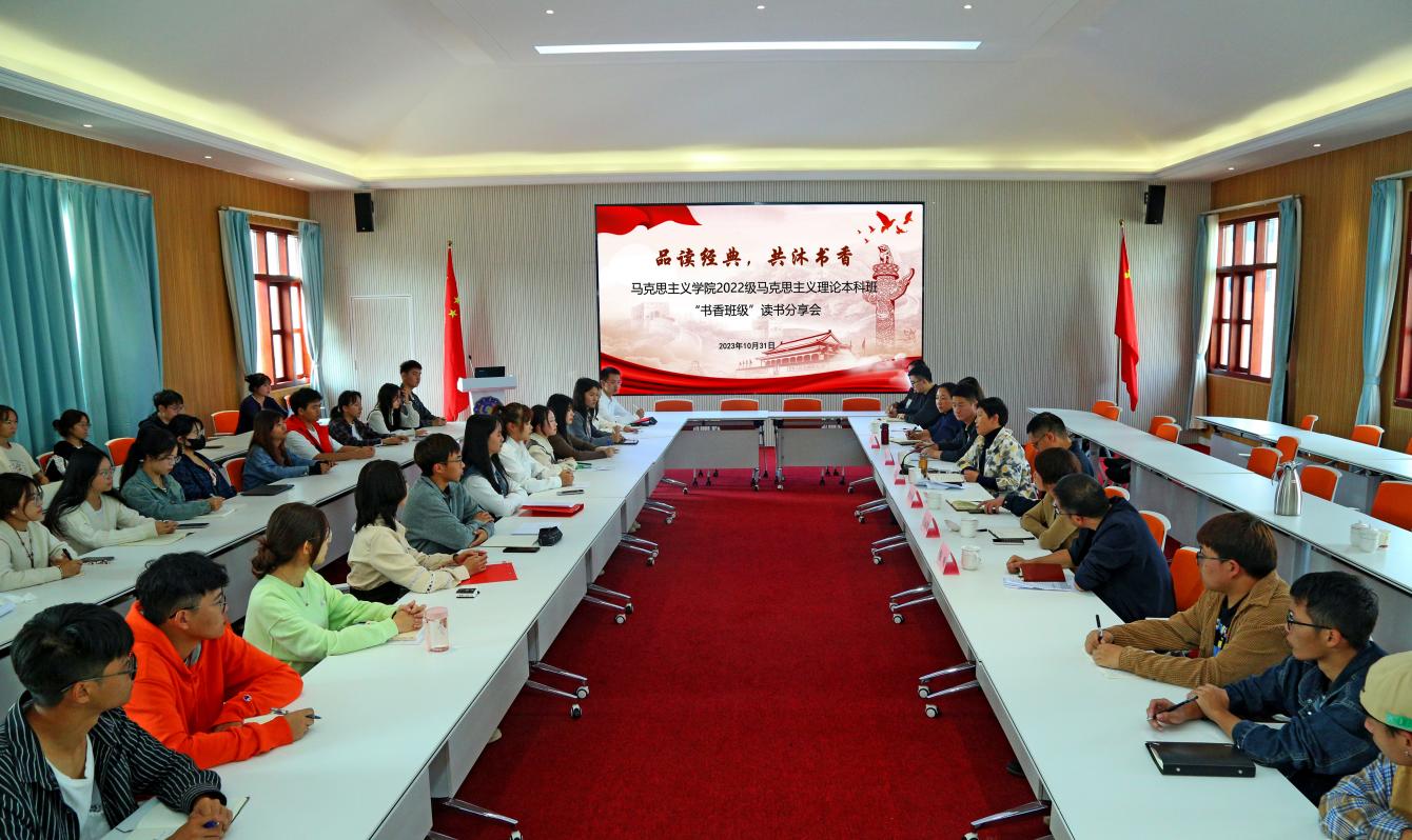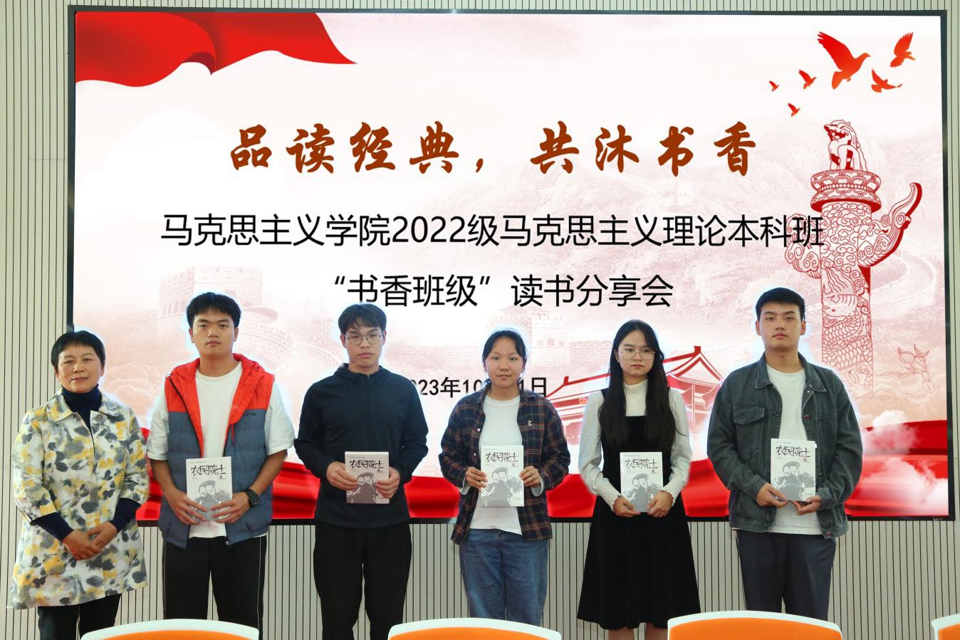 本站消息 10月31日下午,马克思主义学院2022级马克思主义理论本科班“书香班级”读书分享会在校友会堂三楼会议室举行,此次分享会的主题为“品读经典,共沐书香”。校党委书记、2022级马克思主义理论本科班班主任黎素梅出席分享会并讲话。校党委办公室校长办公室、学生工作部、图书馆等部门主要负责人和马克思主义学院领导班子成员参加读书会。