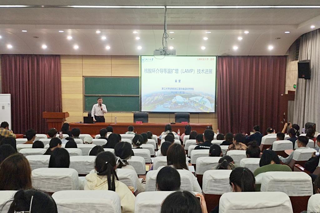 吴坚教授从通过对LAMP技术背景、LAMP扩增产物的检测、集成LAMP系统几个方面系统地介绍了核酸环介导等温扩增(LAMP)技术进展,为食品快速检测方法提供了新思路。重点讲解研究过程中遇到的问题以及如何解决问题,给学生提供了如何进行科学研究的指导。随后在交流环节,吴坚教授严谨详尽地解答了师生们的疑惑。
