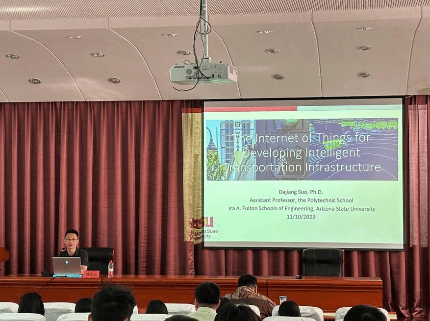本站消息 11月10日,美国亚利桑那州立大学锁大江博士受邀做客“红土地”大讲堂,在继续教育学院报告厅作题为“物联网与智能交通基础设施发展的理论探索与实践”的学术报告。本次讲座由大数据学院副院长彭琳主持,全校150余名师生到场聆听。