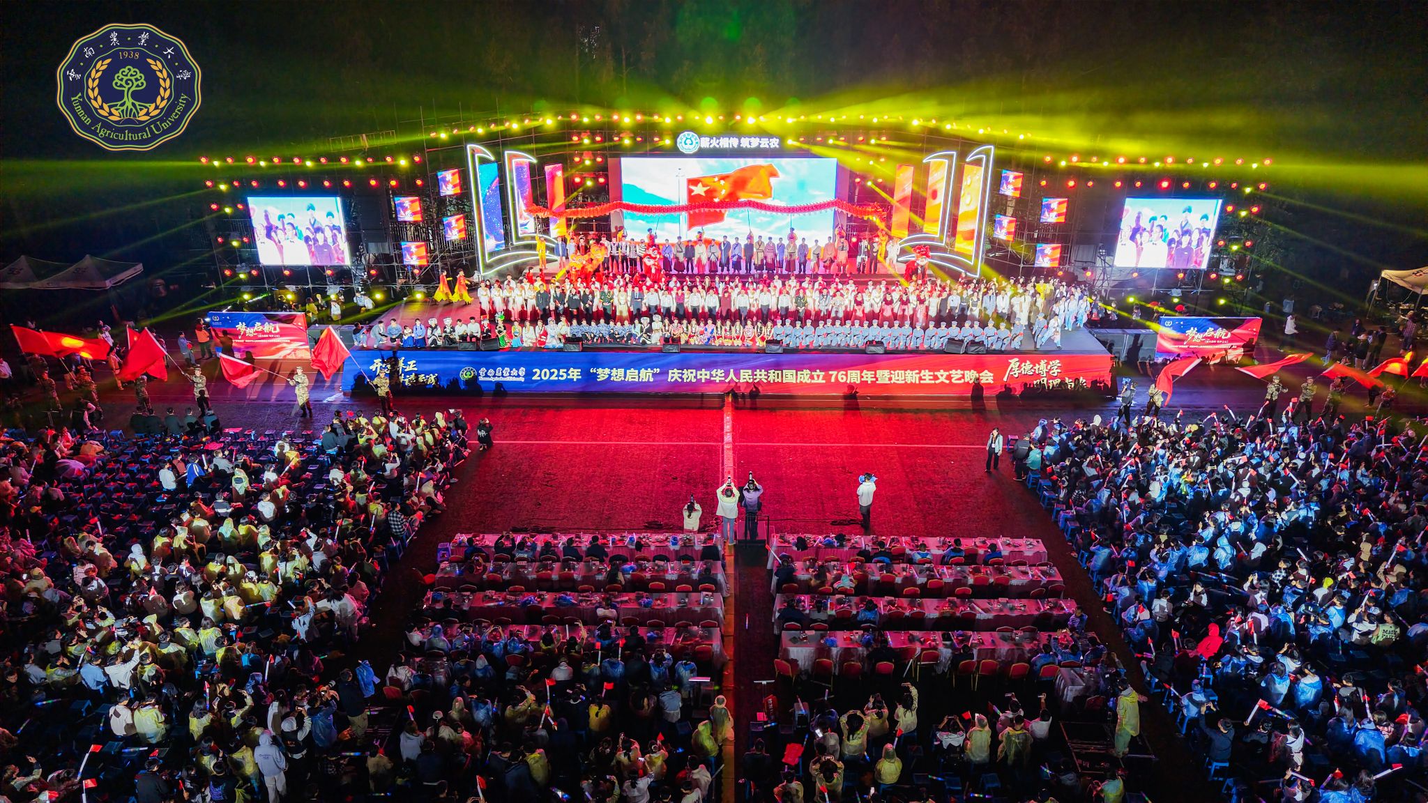 全体在家校领导、各职能部门及学院负责人、2025级全体新生、高年级学生代表共计10000余人欢聚现场,兄弟院校团委、学校校友代表、优秀师生代表、退伍复学代表、常驻科技小院及农民院士科技服务站代表等受邀出席。