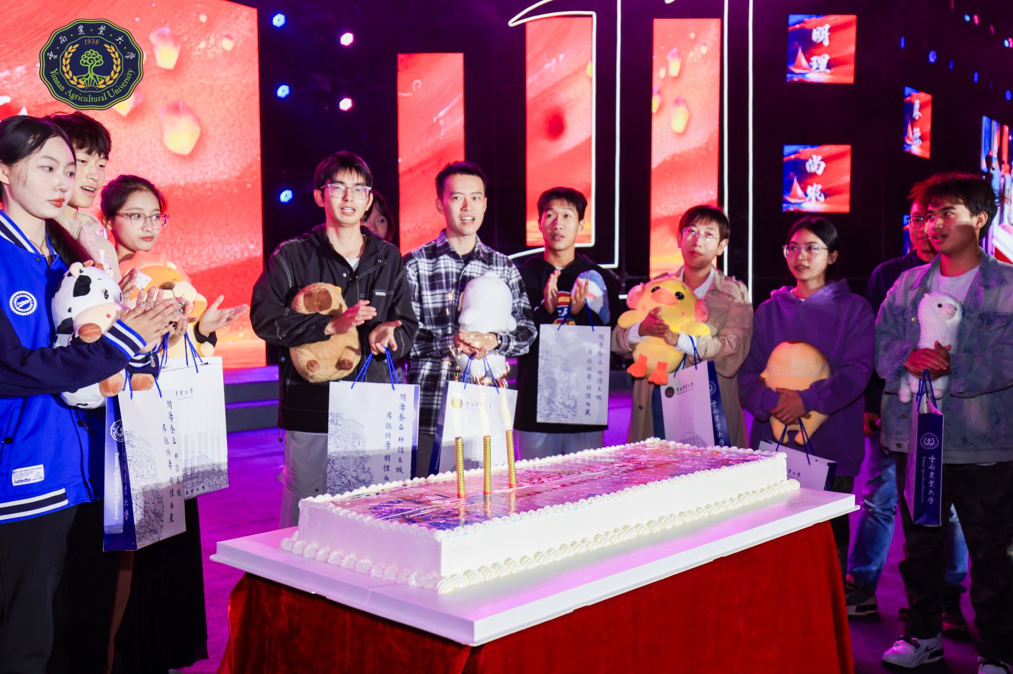现场还开展了爱国歌曲接龙、新生集体庆生及抽奖等环节,气氛热烈。