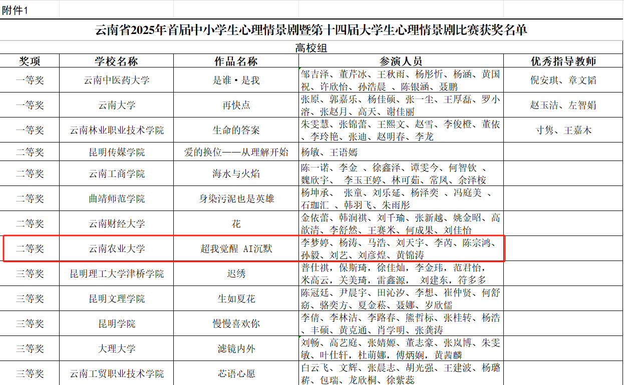 学校心理剧作品《超我觉醒 AI沉默》荣获第十四届大学生心理情景剧比赛二等奖;工作机制案例《五感疗心:农业院校自然疗愈体系下的心理活动模式创新》入选向阳花学生心理健康促进行动典型案例;《大学生心理健康教育》入选云南省2025年学生心理健康教育精品课程(高校组)。