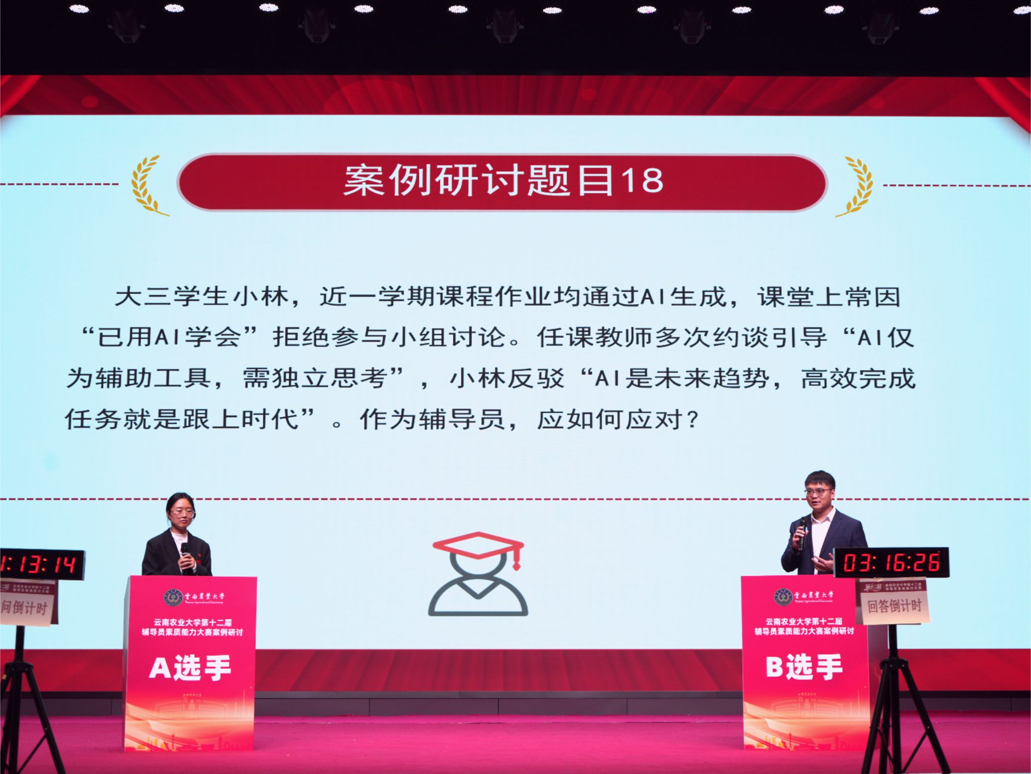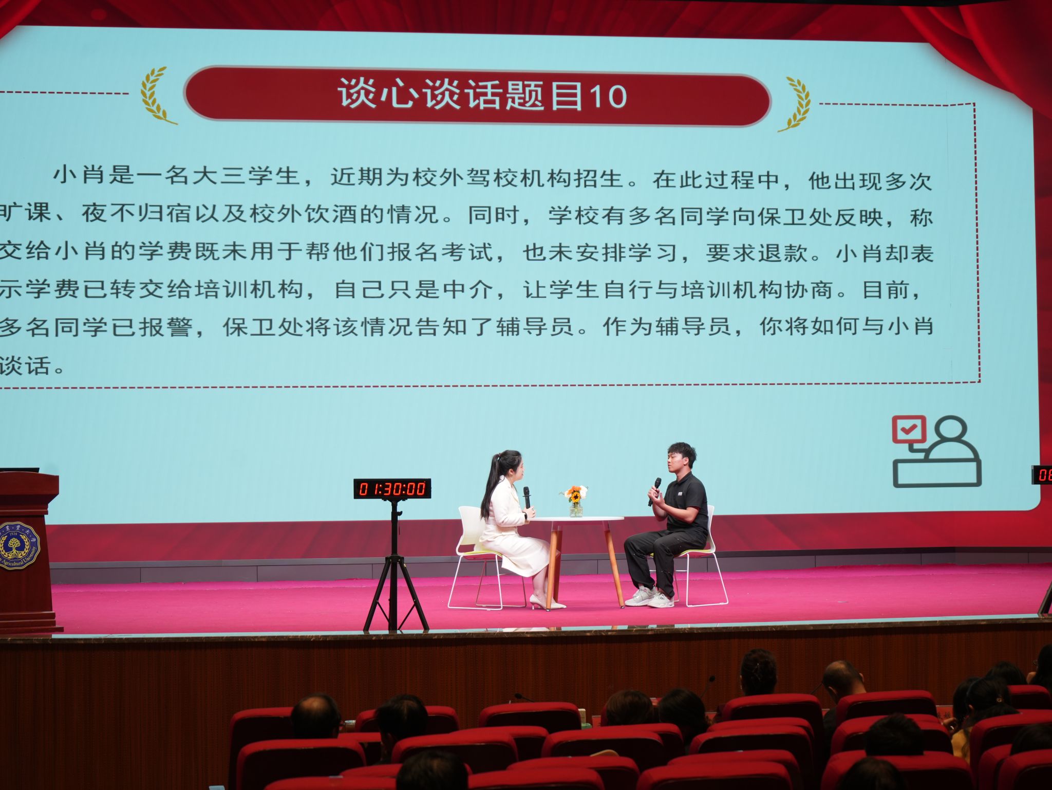 在10月31日的案例研讨环节中,22选手以 “一问一答” 的形式开展案例研讨,深入辨析问题本质、研讨解决方案,充分展现应急处突和理论应用能力。在谈心谈话环节,选手结合现场抽取的学生背景资料,以情景再现方式开展针对性沟通,在温情对话中化解困惑、引导成长,展现出对学生成长规律的深刻把握和娴熟的沟通技巧。整场决赛中,比赛的案例均来源一线学生工作素材,参赛辅导员精神饱满、思路清晰,经过激烈角逐,烟草学院訾鼎淳老师凭借出色表现斩获一等奖,另有 2 名选手获二等奖、3 名选手获三等奖、4 名选手获优秀奖。