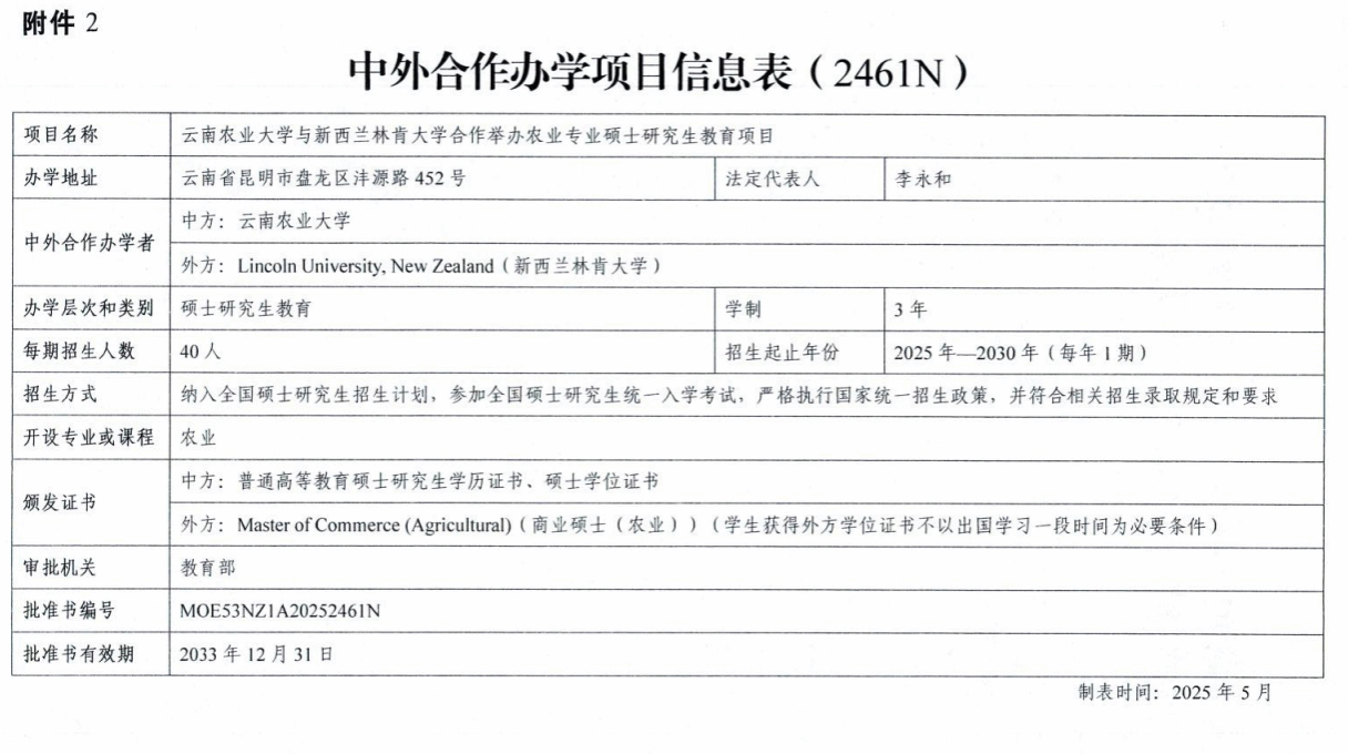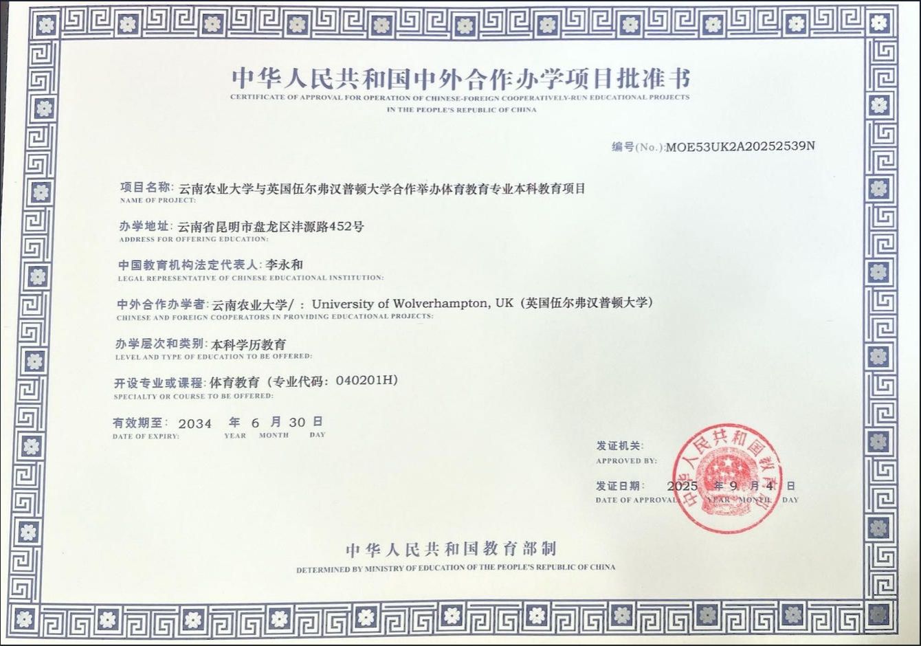 成功获批并高质量运行与新西兰林肯大学合作的“农业专业”硕士教育项目,标志着学校研究生层次中外合作办学项目实现突破。与英国伍尔弗汉普顿大学合作的“体育教育(校园足球)”项目,作为省内首个体育类中外合作办学项目,丰富了云南省国际化体育人才培养体系。云南农业大学伍尔弗汉普顿大学农业工程学院已获云南省教育厅和云南省政府批准,若获教育部批准,办学初期,学院将开设2个本科专业:机械设计制造及其自动化(英方:机械工程,Mechanical Engineering)和人工智能(英方:网络安全,Cybersecurity);2个硕士专业:项目管理(Project Management,中方:项目管理)和人工智能(Artificial Intelligence,中方:农业信息技术与人工智能);1个博士专业:建成(筑)环境(Built Environment,中方:农业资源环境与区域绿色发展)。将会实现中外合作办学二级学院的突破。