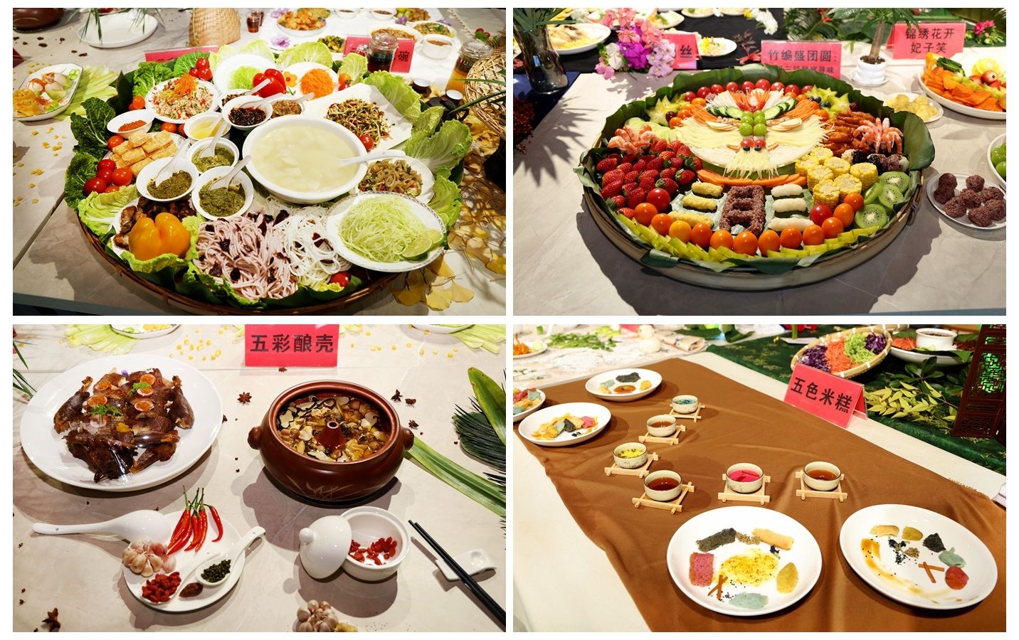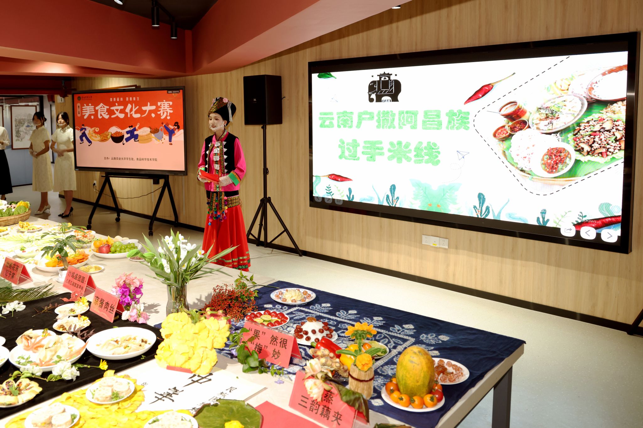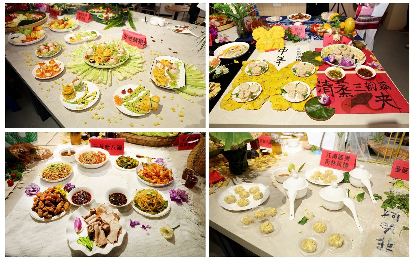 本次大赛由学生处、食品科学技术学院主办,以“健康食尚 创意新生”为主题,参赛选手充分利用学校学生社区共享厨房及食品科学技术学院食品加工实验室,烹饪出种类丰富的民族特色菜肴。经过前期初赛的筛选,决赛共有来自各学院的13组选手制作了傣味柠檬撒、过手米线、景颇鬼鸡、三月三簸箕宴、五彩酿壳等各具特色的菜品。参赛作品既突出营养科学和烹饪创新,又融入云南各地的民族特色和文化底蕴,打造出营养均衡、低热量、高颜值的民族现代美食。