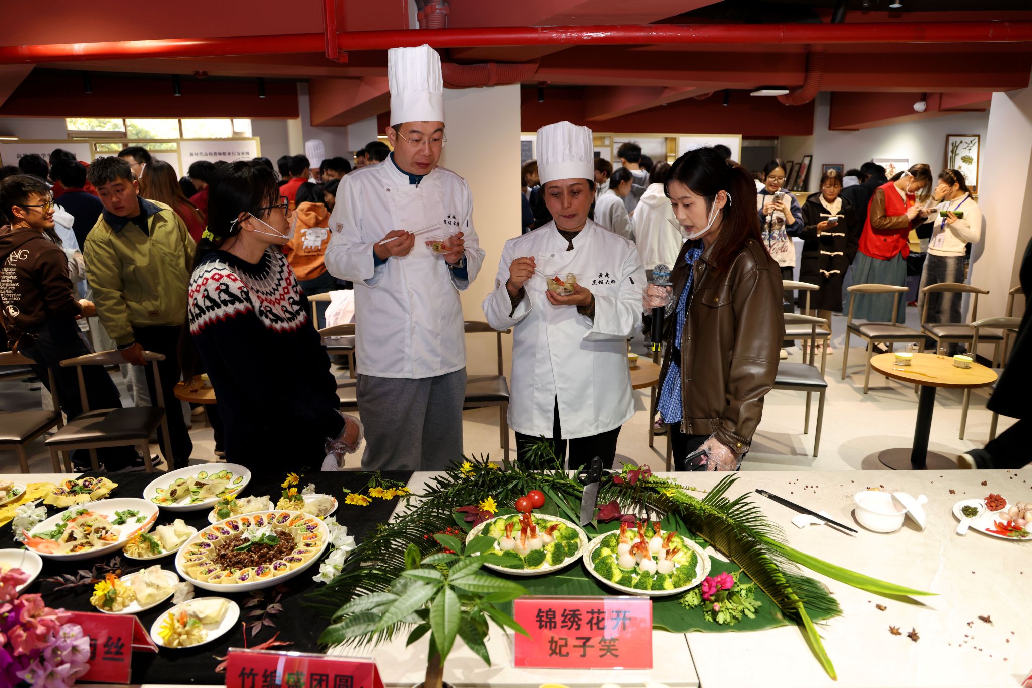 在评审阶段,参赛选手依次登台,结合制作菜品直观展示从食材甄选、调料搭配、烹制方法等关键制作细节的要点,以及菜肴背后承载的民族习俗、地域传说等文化内涵。活动特邀国家级滇菜大师徐志强,省级滇菜大师普岳红、肖智超担任评委,并逐一品尝并为参赛菜品点评打分。校领导和在场师生共同了解现场一道道云南传统美食的制作工艺、营养价值和文化故事,直观感受云南多民族交融共生下,饮食文化兼具多元与独特的魅力。