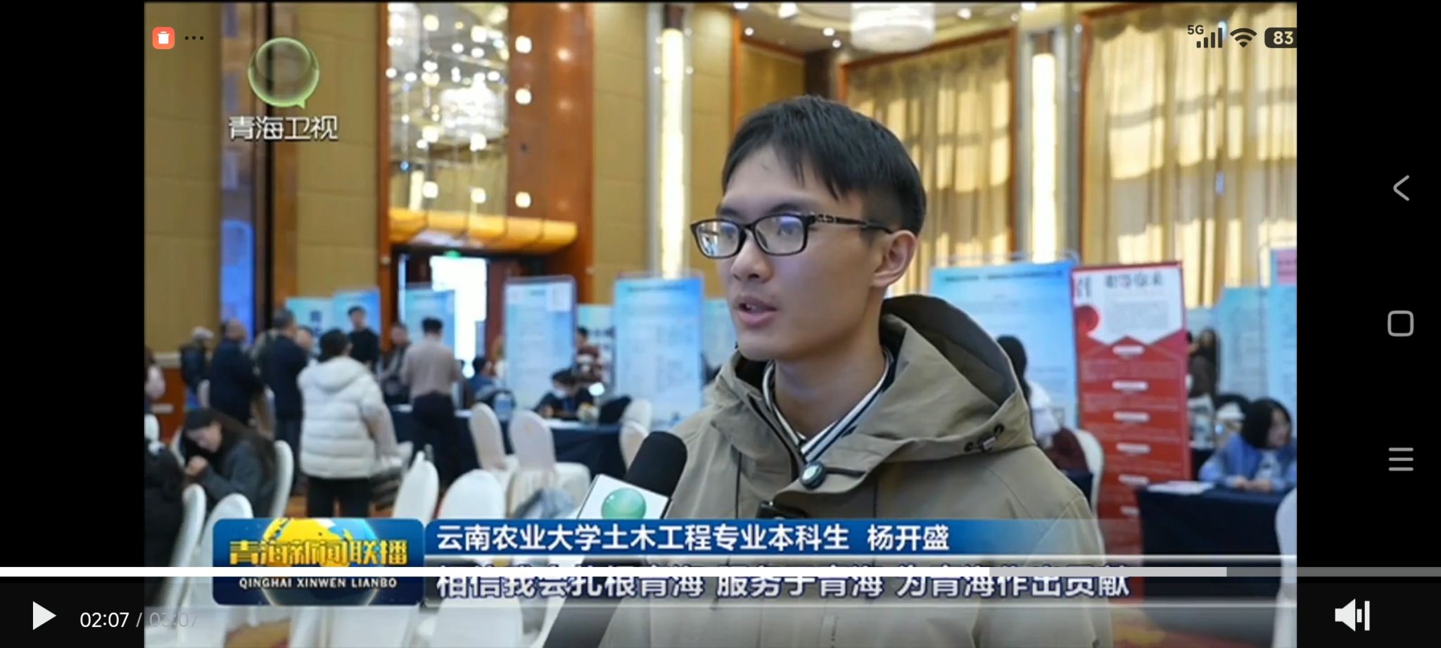 学校2026届土木工程本科专业毕业生杨开盛同学在现场接受了青海电视台的采访。他表示,接到学校的通知后就积极响应并报名参加了此次招聘活动,通过现场交流,他对青海省的人才引进政策有了深刻的理解,同时也找到了自己心仪的岗位,如果以后有幸能到青海工作,一定会扎根青海、服务青海、为青海建设做出贡献。