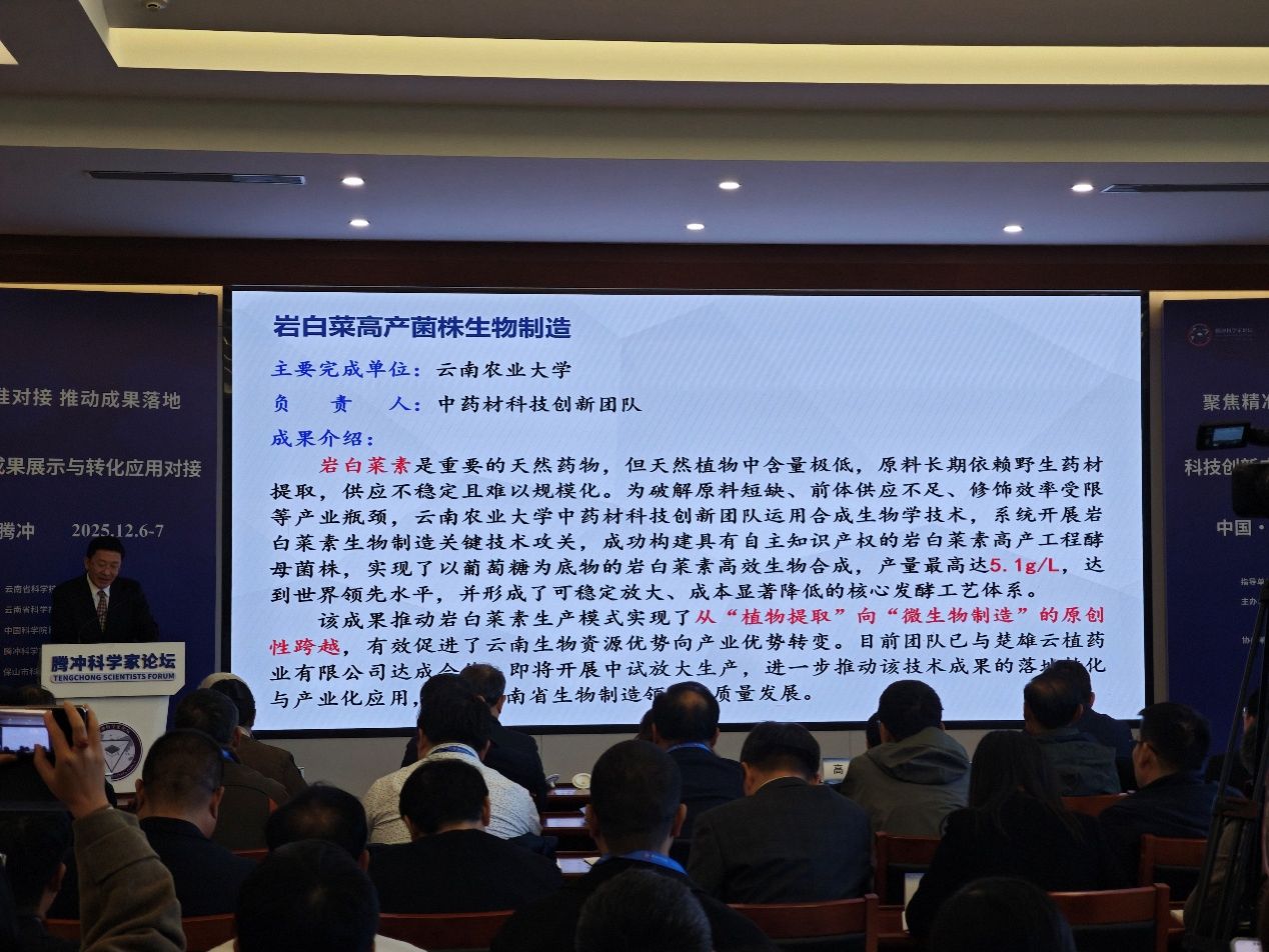 会上,岩白菜素高产菌株生物制造成果转化项目获省科学技术院成果转化第一推介项目,该项目采用合成生物学技术,实现了处方药岩白菜素在微生物细胞工厂的高效生产,产量达到国内领先水平,大幅降低了现有生产成本,标志着我校在生物制造产业创新突破转化落地。翡翠天麻系列新品种与蜜环菌菌株转让项目,推动了中药材产业品种化的市场进程,为打造腾冲翡翠天麻产区提供了有力的科技支撑。