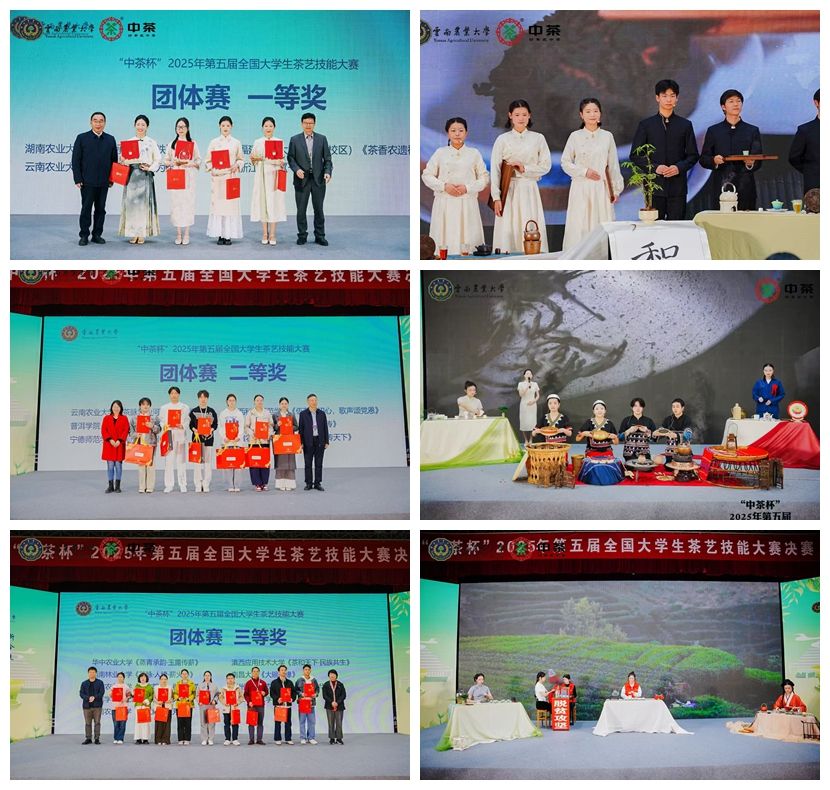团体赛角逐中,学校参赛团队凭借深厚的茶文化积淀与精妙的编排设计,展现出高水平的团队协作能力与茶文化解读能力。其中,作品《生熟同源,何为至境》荣获一等奖;《茶脉贯山河 同心铸华章》斩获二等奖;《薪火新茶映芳华》喜获三等奖。