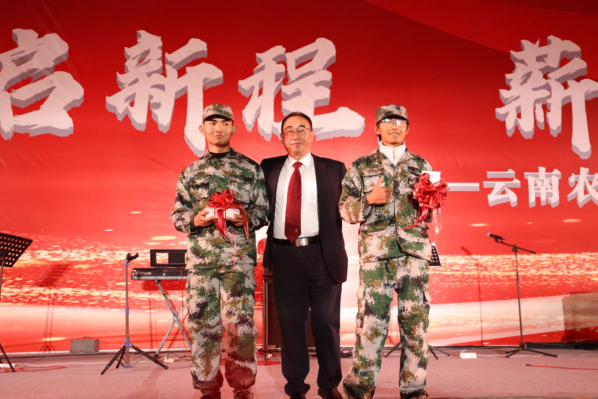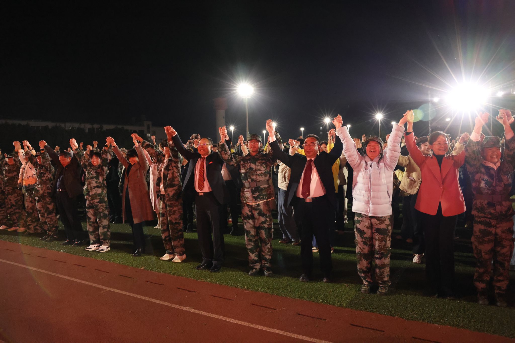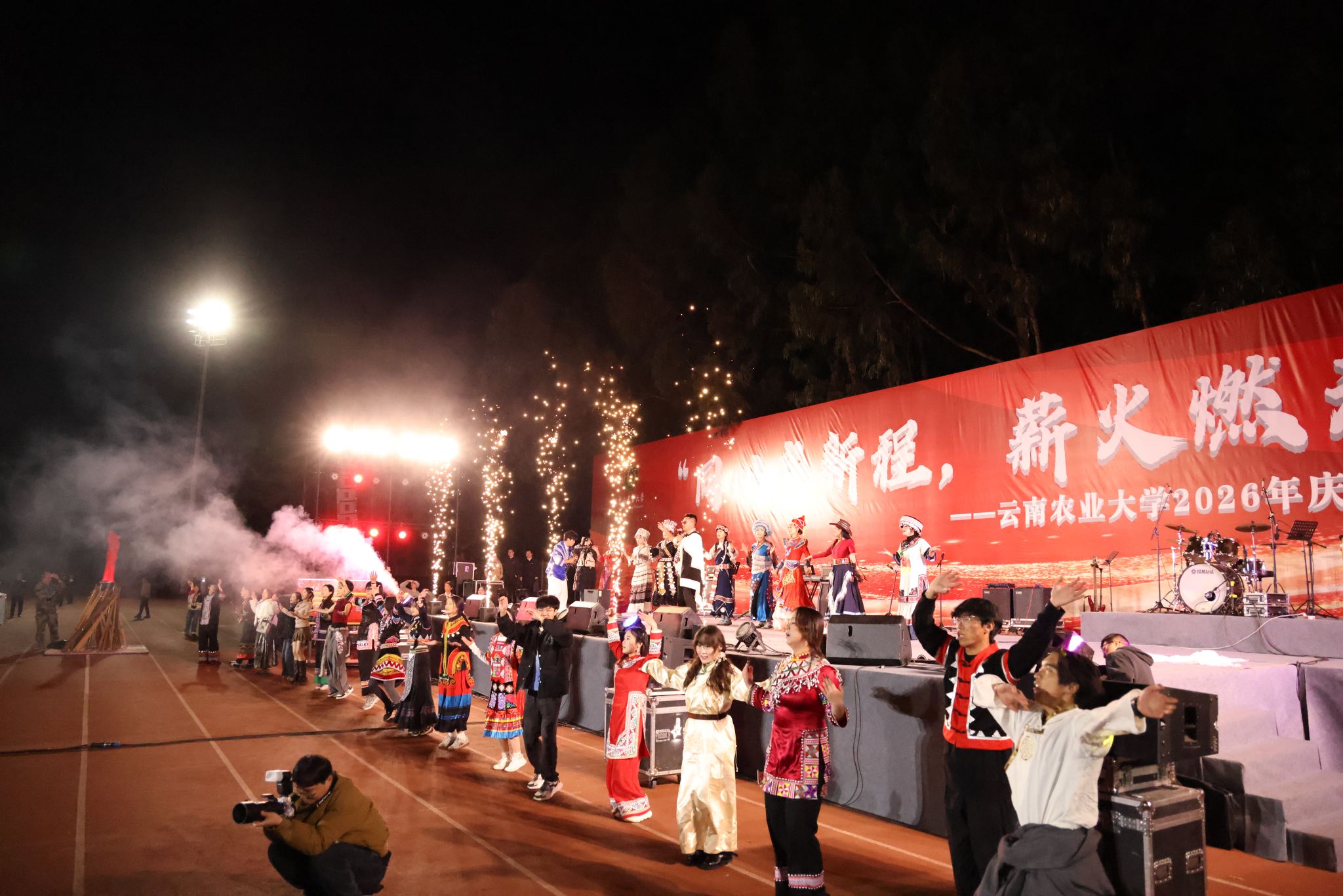 随着游园气氛渐入高潮,“同心启新程 薪火燃未来”2026年庆元旦文艺晚会在田径场舞台活力开演。来自云南财经大学、云南财经职业学院的同学们助演街舞、傣族舞、歌曲等节目,本校师生则通过戏曲选段、原创说唱《云里南方》、乐队联唱等多元形式,展现云农青年才情并茂、昂扬自信的青春风采。校领导登台勉励军训学子并致以新年祝福,随后与全场师生携手集体打跳,手拉手、心连心,将晚会气氛推向顶峰。整场晚会掌声、欢呼声不断,汇聚成一片温暖的欢乐海洋。