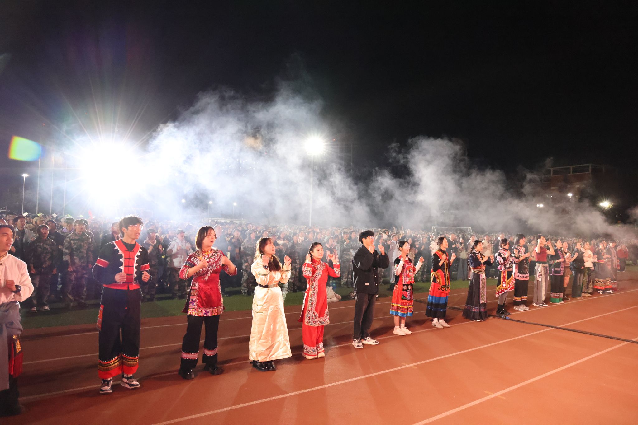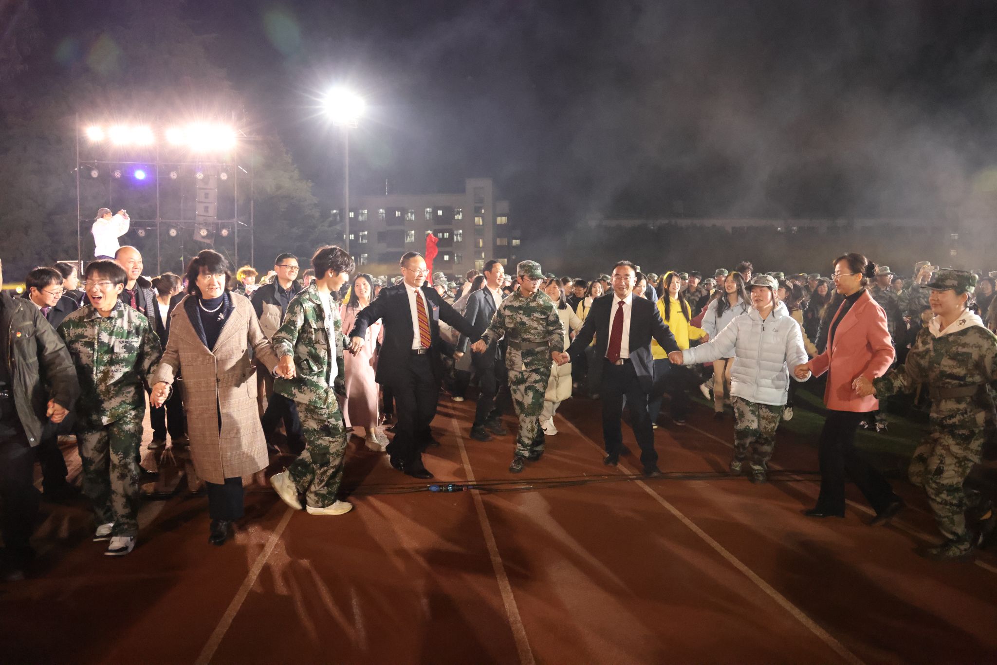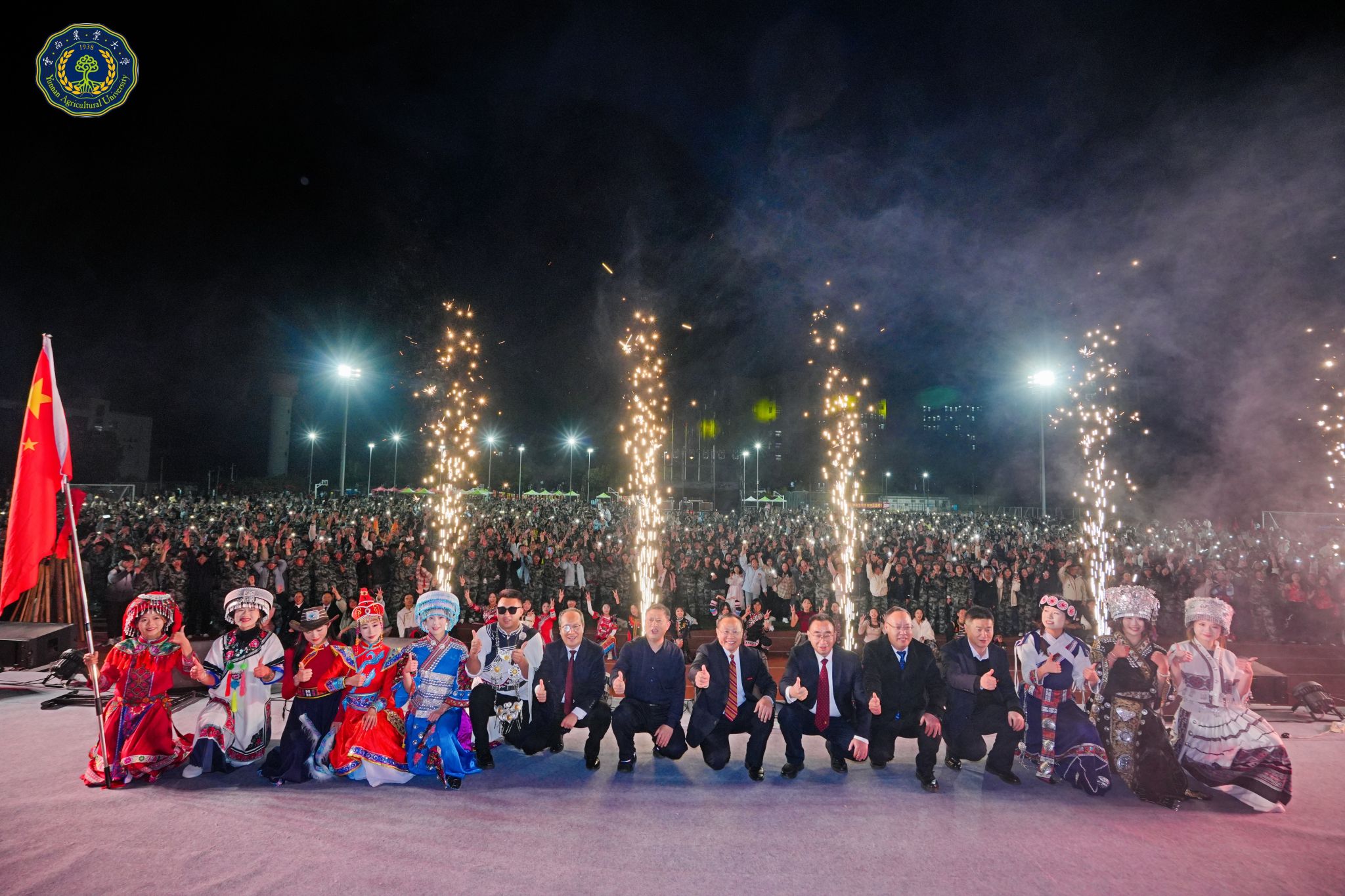 随着游园气氛渐入高潮,“同心启新程 薪火燃未来”2026年庆元旦文艺晚会在田径场舞台活力开演。来自云南财经大学、云南财经职业学院的同学们助演街舞、傣族舞、歌曲等节目,本校师生则通过戏曲选段、原创说唱《云里南方》、乐队联唱等多元形式,展现云农青年才情并茂、昂扬自信的青春风采。校领导登台勉励军训学子并致以新年祝福,随后与全场师生携手集体打跳,手拉手、心连心,将晚会气氛推向顶峰。整场晚会掌声、欢呼声不断,汇聚成一片温暖的欢乐海洋。