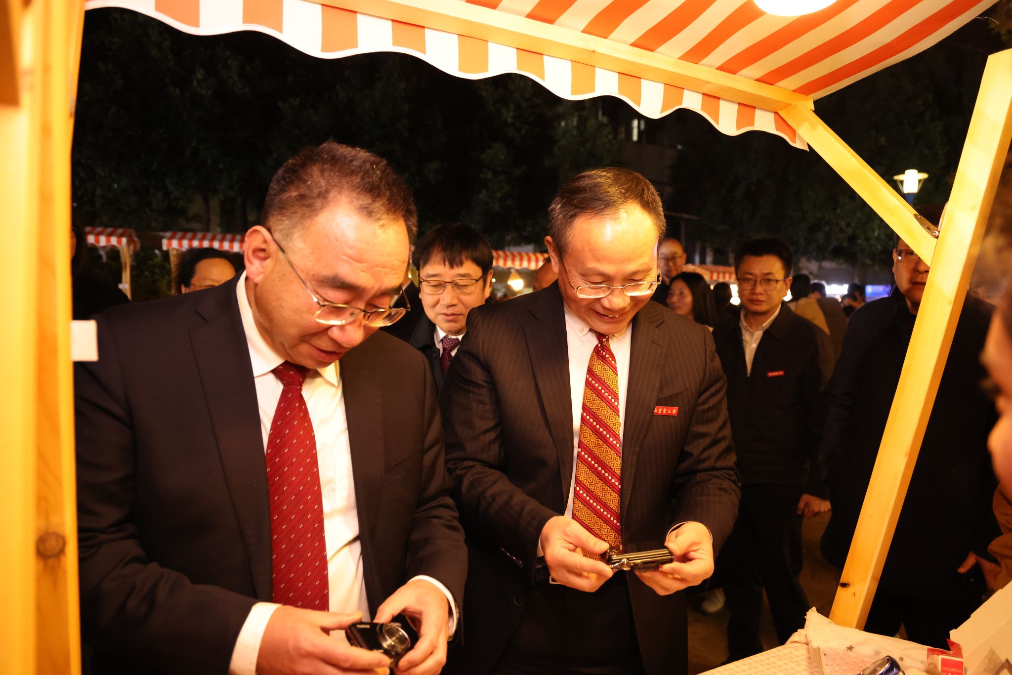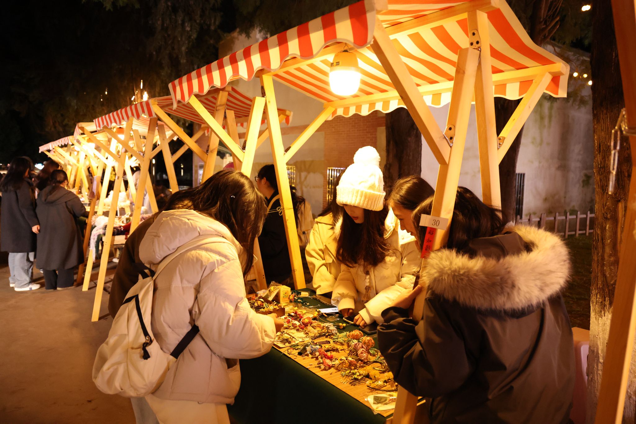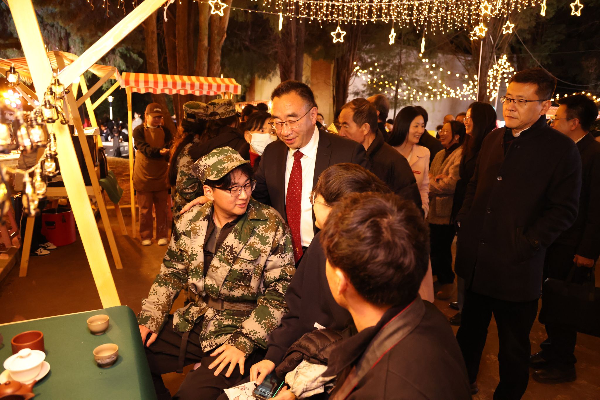 同时,东校区田径场化身为欢乐的海洋。“灯影谜趣·游园寻梦”游园灯会与“手作匠心·创意无限”星空市集同步展开,灯笼高悬、笑声洋溢。猜灯谜、投壶、木射、写对联等十余项传统游艺项目与糖画、糖葫芦等特色美食相映成趣;校领导与中层干部深入现场,与同学们一起参与游戏、亲切交流,温暖互动中凝聚起浓厚的校园情谊。