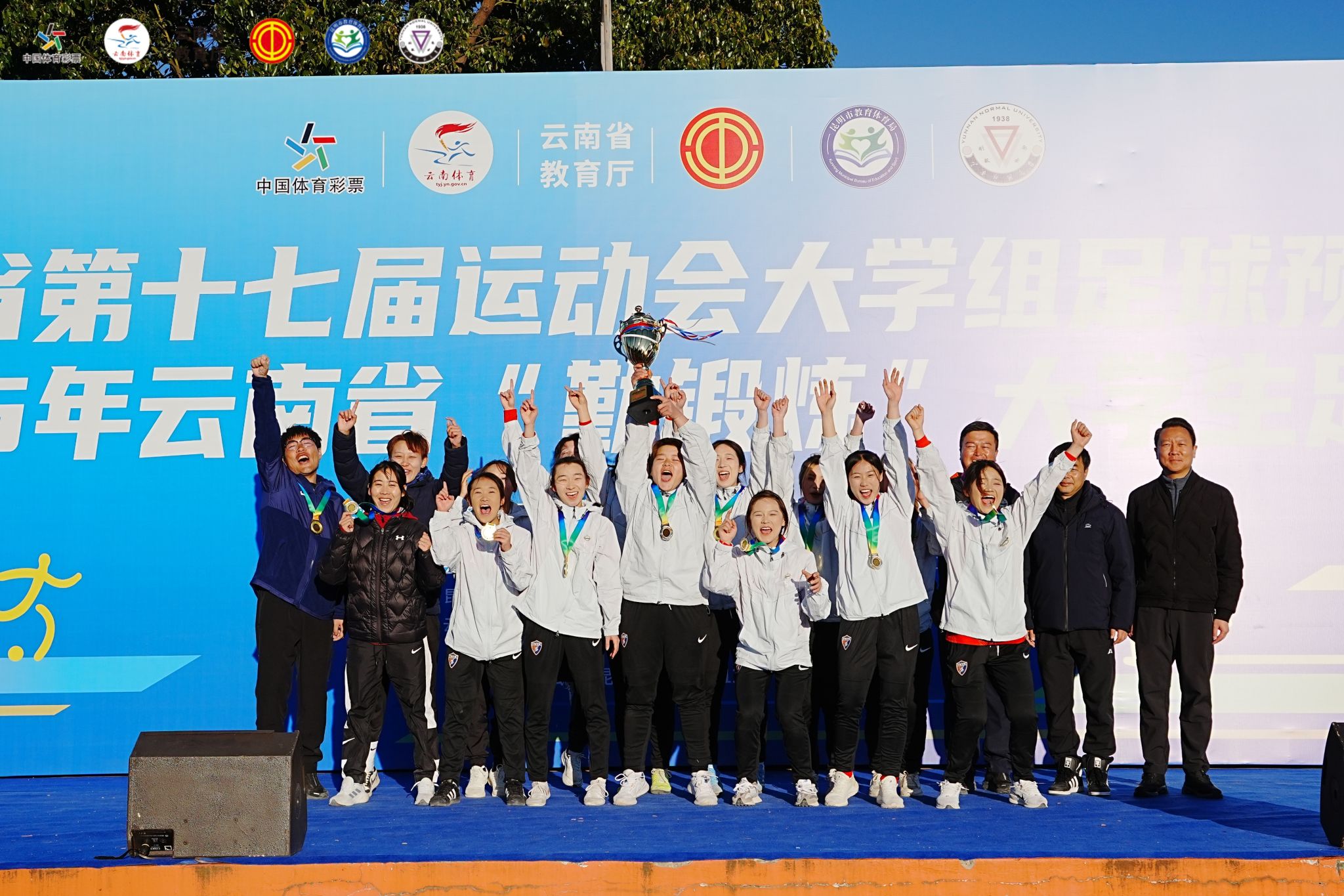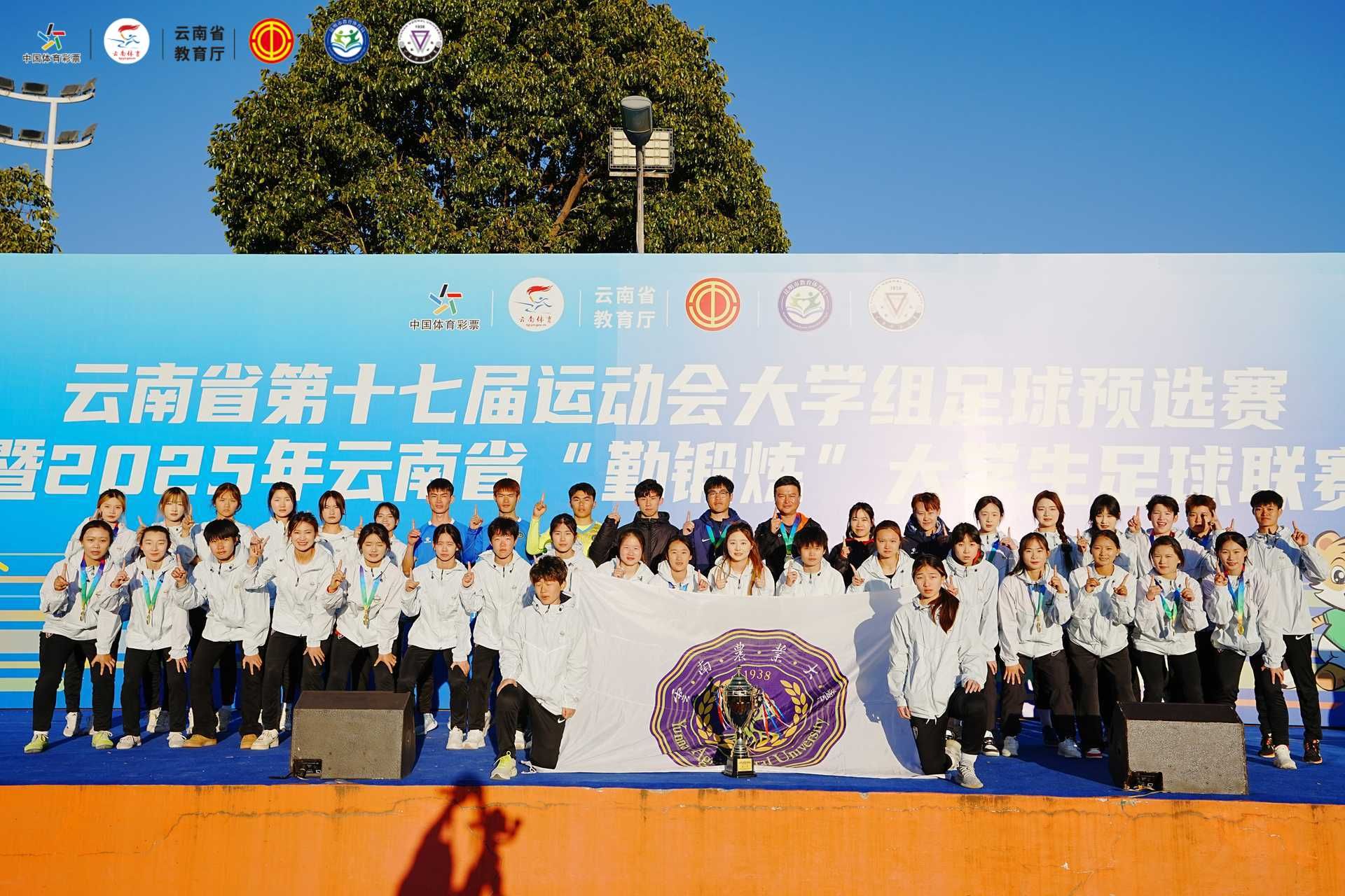 本站消息 在近日闭幕的云南省第十七届运动会大学组足球预选赛暨2025年云南省“勤锻炼”大学生足球联赛中,学校女子足球队以全胜战绩,包揽了女子丙组11人制和5人制两项冠军。
