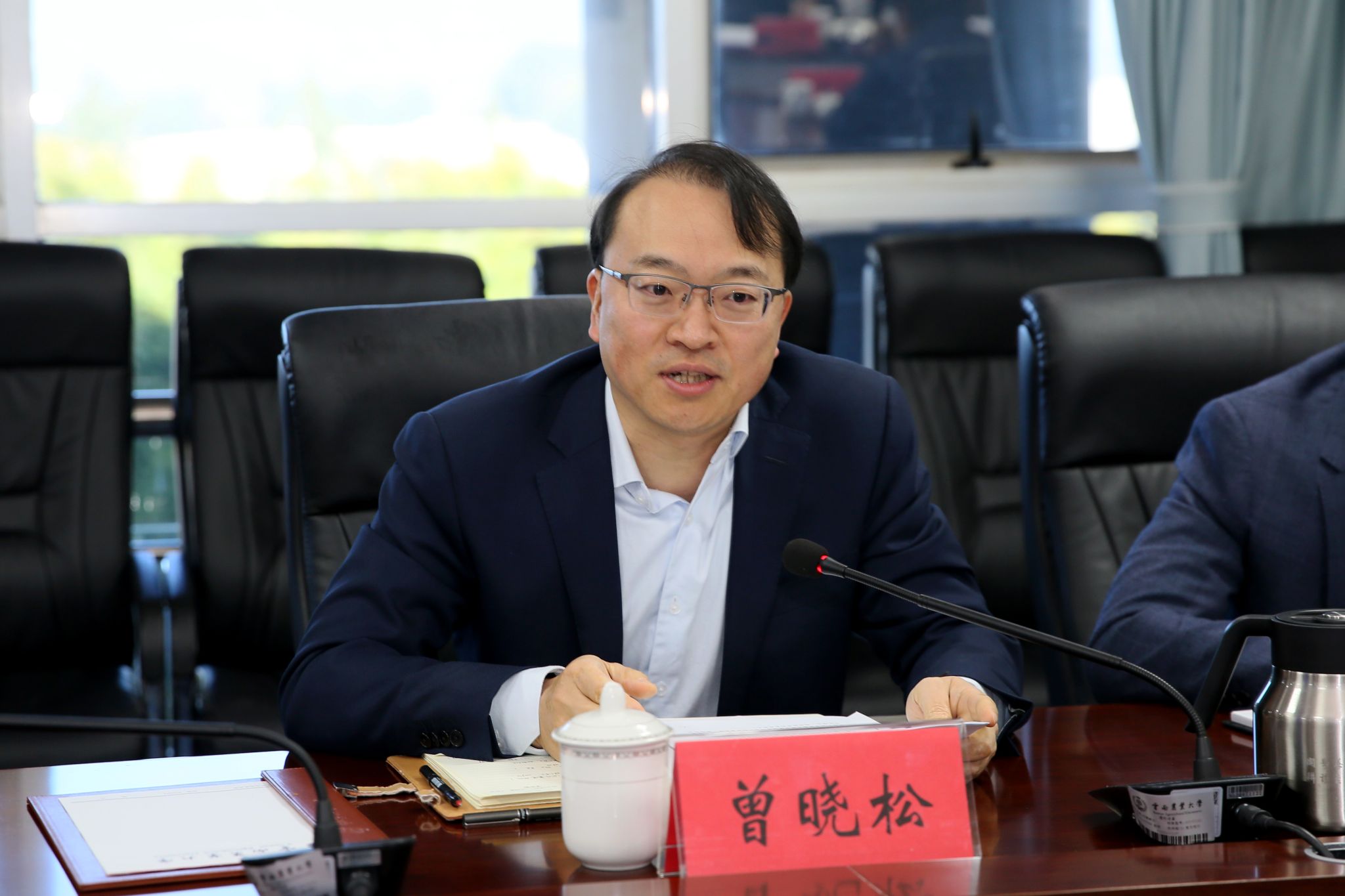 李永和对曾晓松一行来校调研表示诚挚欢迎。他简要介绍了学校历史沿革、师资队伍、学科建设、科研工作、人才培养及社会服务等方面的情况。他强调,学校将以此座谈为契机,与富滇银行在金融服务创新、复合型人才培养、实习就业渠道拓展、产学研深度融合等领域开展务实合作,共同构建“金融+教育+农业”的新业态,为服务云南高原特色农业高质量发展,推进乡村全面振兴贡献力量。