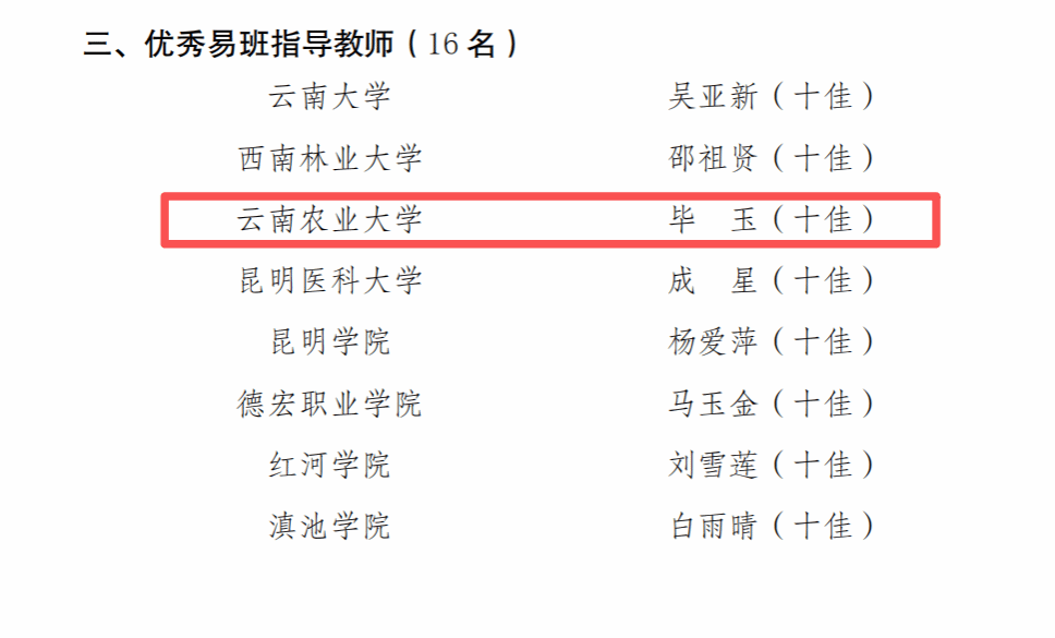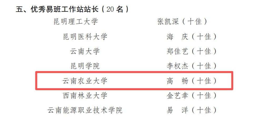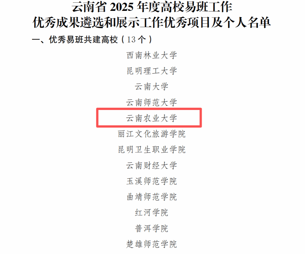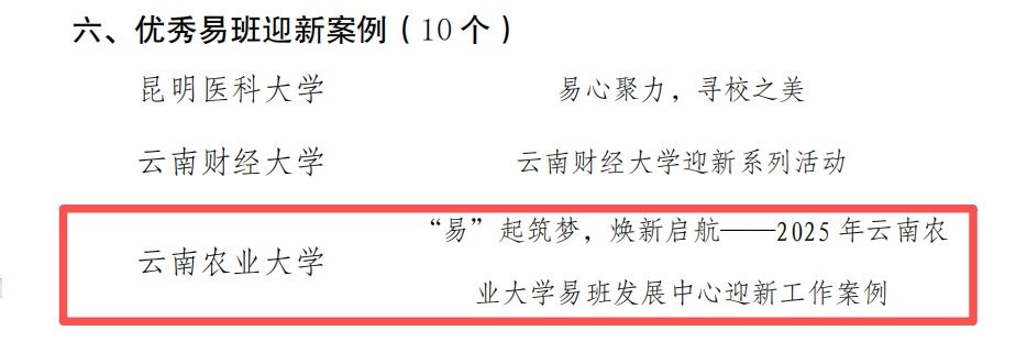在2025年度评选中,学校成功入选优秀易班共建高校,学校申报的“易”起筑梦,焕新启航——2025年云南农业大学易班发展中心迎新工作案例获评优秀易班迎新案例,两大集体荣誉是对学校易班整体建设工作的又一次高度肯定。学校毕玉老师获评云南省十佳易班指导教师,高畅同学当选云南省十佳易班工作站站长(限报4项,获评4项),多名师生凭借专业能力和用心付出,在全省易班工作者中脱颖而出。