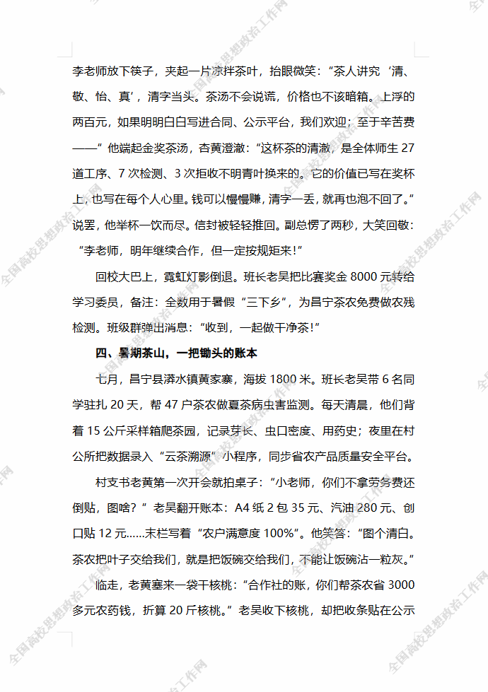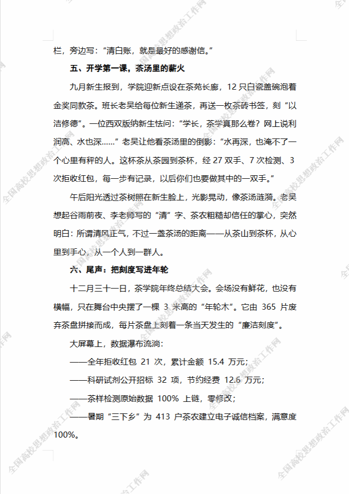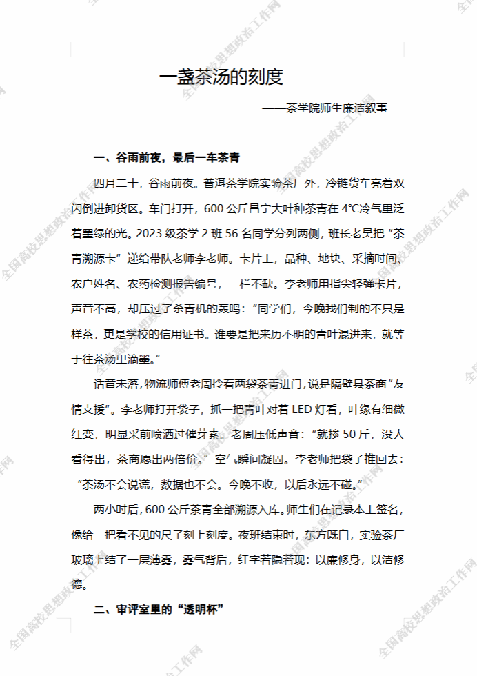 本站消息 近日,教育部网站发布《关于第十届高校廉洁教育系列活动结果的公示》,学校两件作品在全国评选中脱颖而出,其中《一盏茶汤的刻度》入选“话廉修德”校园征文优秀作品,《稼穑廉韵——云农廉洁徽章》入选“绘廉铸魂”创意优秀作品。