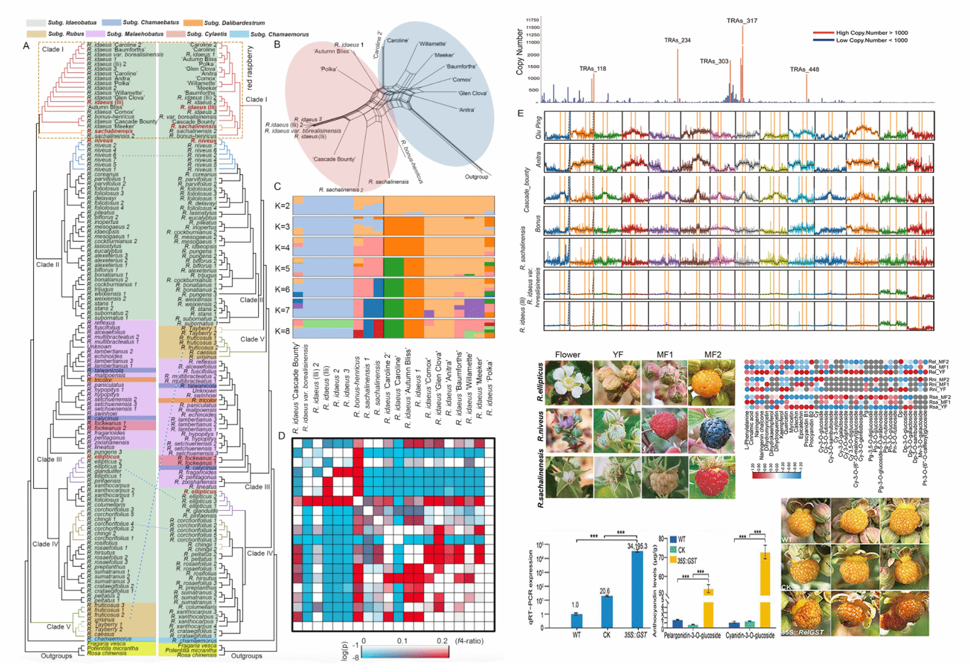 进一步对涵盖悬钩子属80个物种的125份材料进行系统发育分析,发现种间杂交与不完全谱系分选导致了复杂的进化历史。基于着丝粒单倍型覆盖度分析对红树莓品种的祖先成分追溯,发现北美与欧洲品种携带较为单一的亚基因组(i型),而中国分布的野生类群保留了更多祖先遗传多样性(i和I型),成为改良广布品种遗传背景的宝贵资源。此外,通过整合红、黄、黑三种果实颜色的不同悬钩子物种主要发育阶段的代谢与表达谱数据,揭示了果实品质性状形成的遗传机制。