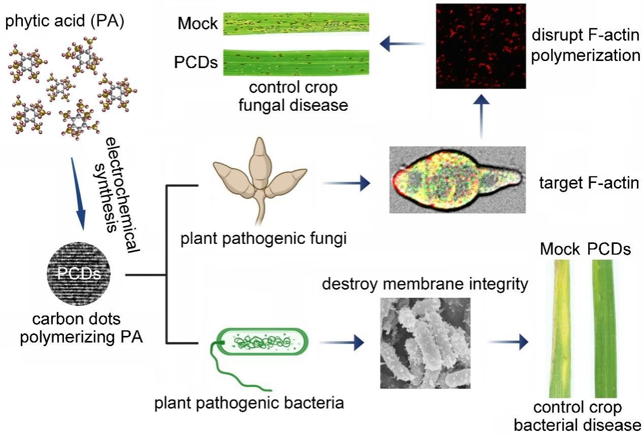 近日,学校植物保护学院王莫课题组在国际著名碳材料期刊Carbon(IF=11.6)上发表题为“Phytic acid-polymerized carbon dots efficiently inhibit various plant pathogens growth and function as a protective agent for controlling crop diseases”的学术文章,系统揭示了植酸碳点纳米材料抑制植物病原真菌和细菌的作用机理及其在作物病害防控中应用潜力。